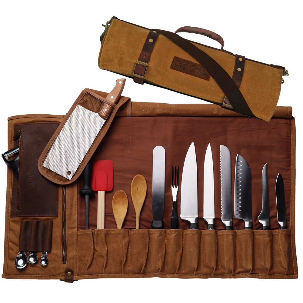 Waxed Canvas Leather Chef Knife Roll By Chef Sac For Culinary Pros